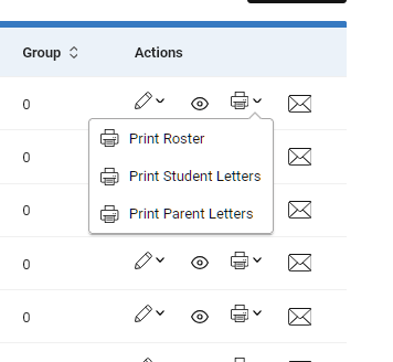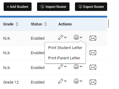 You can also print letters for the entire class from the roster list. Click the View Roster icon. Then click the print icon and choose Print Letters. |