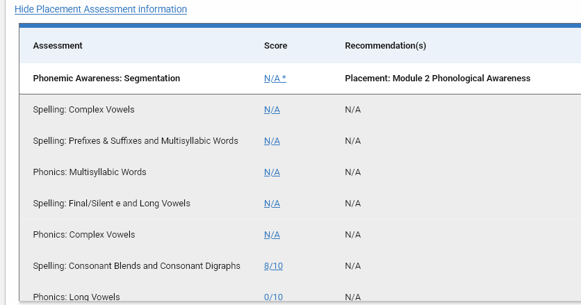 | This report can be expanded to show the Placement Assessment information. | ||