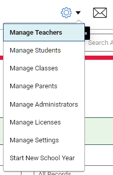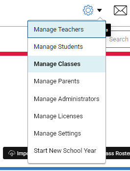 | If the teacher account must be removed, the school administrator can assign the teacher's class(es) to another teacher. Access the Class Management screen from the gear icon. | ![]() |